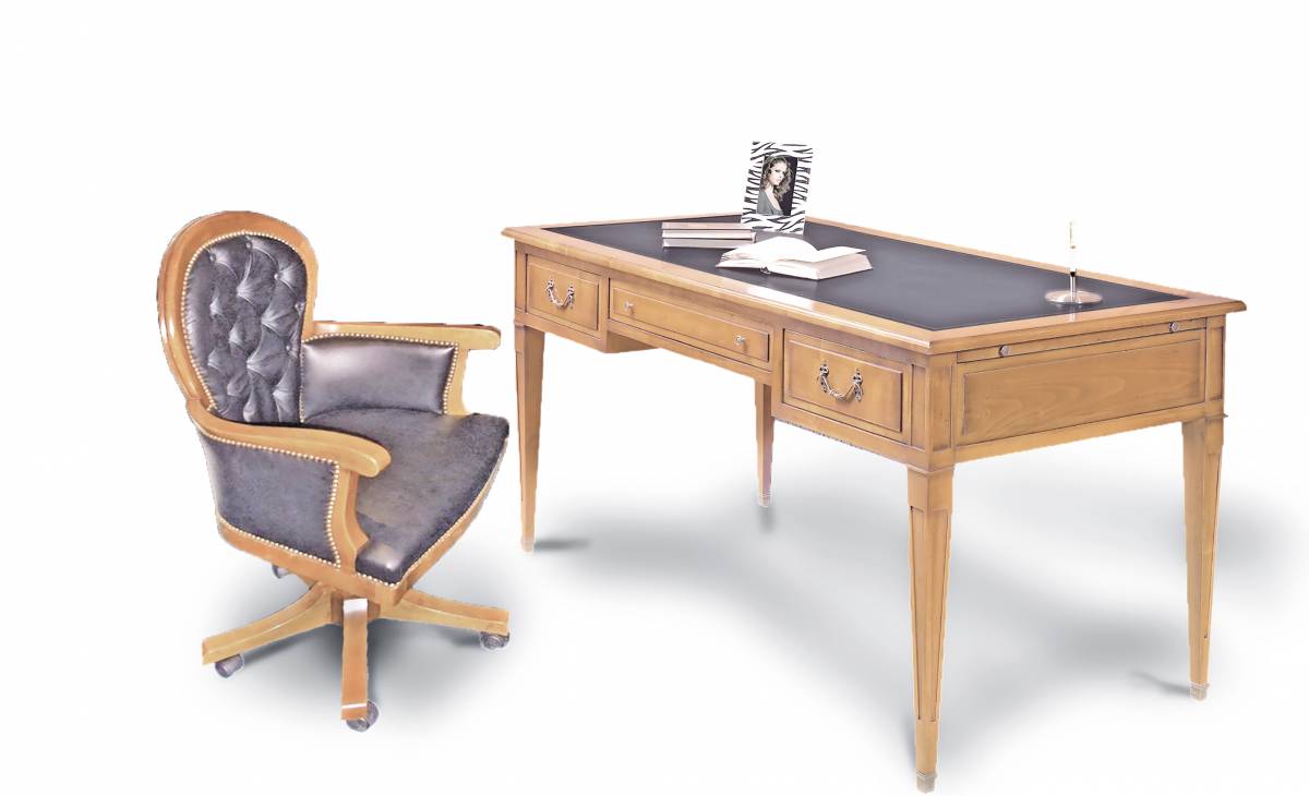 Bureau en Merisier massif, avec 3 tiroirs et 2 tirettes, plateau en cuir noir. Finition antiquaire, quincaillerie en bronze.