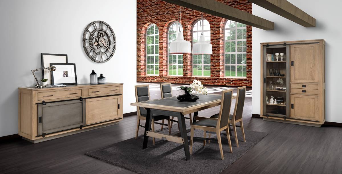 Le bahut est conçu en chêne massif avec une porte coulissante en métal en façade. Les chaises sont également en bois de chêne 100% massif.